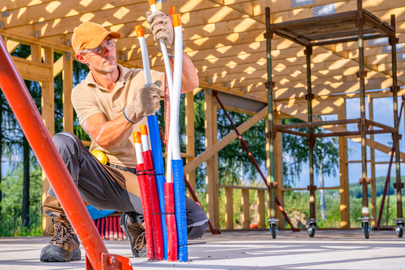 A plumber installs and organizes colorcoded PEX piping at a residential construction site, preparing the system for water distribution. GETTY IMAGES