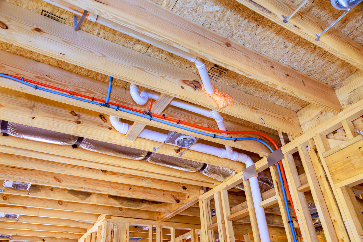 PEX water supply lines and PVC drain piping installed through exposed framing, showing rough-in plumbing during residential construction. GETTY IMAGES