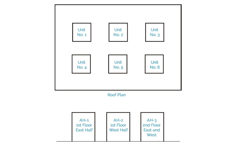 This requirement allows for inspection, servicing, repair or replacement of the correct equipment in the event of an emergency or scheduled maintenance, without interrupting neighboring spaces’ equipment. When appliances are not marked, service personnel typically cycle the equipment on and off to determine which equipment to service, unless the equipment or appliance is easily identifiable. Figure 303.6 illustrates examples of identification when more than one appliance is installed on the roof of a building or when appliances are grouped within a building.