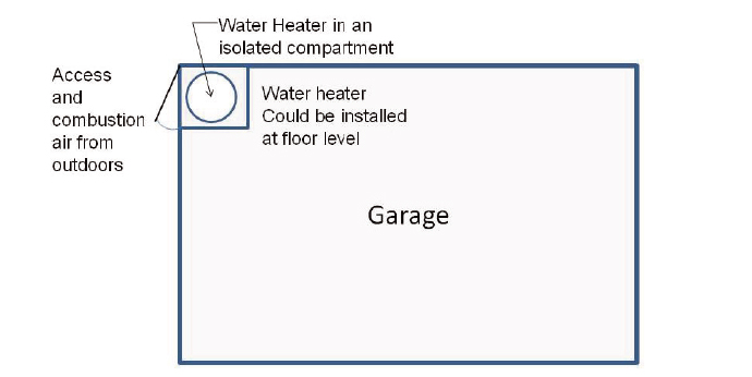 The code allows for the installation of an appliance at floor level, if it is in a separate compartment and has access and combustion air from outside the garage (see Figure 305.1.2).