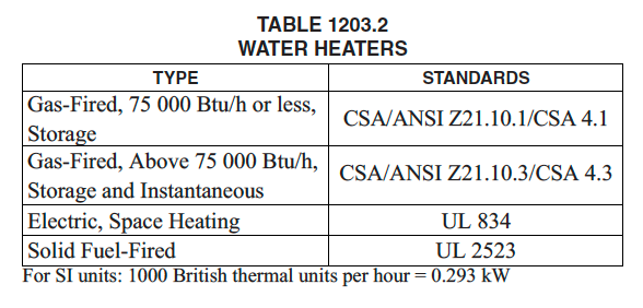 1203.2 Dual Purpose Water Heaters. Water heaters utilized for combined space-heating and water-heating applications shall comply with the standards referenced in Table 1203.2, and shall be installed in accordance with the manufacturer’s installation instructions. The total heating capacity of a dual purpose water heater shall be based on the sum of the potable hot water requirements and the space heating design requirements corrected for hot water first-hour draw recovery.