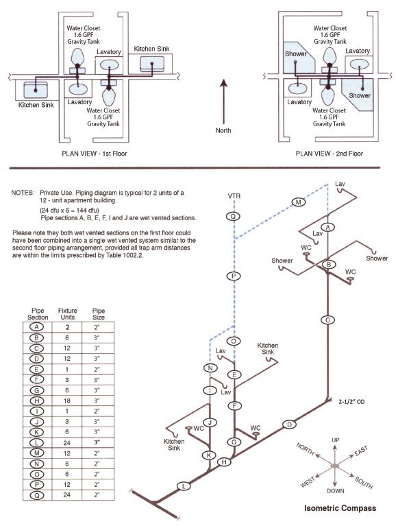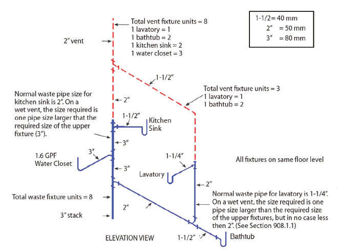 The common vent may also need to increase if it is used for aggregate venting according to Section 904.0. Notice in Figures 908.1.2a and 908.1.2b the reduction in the amount of vent piping when vertical wet venting is applied as well as examples for sizing.